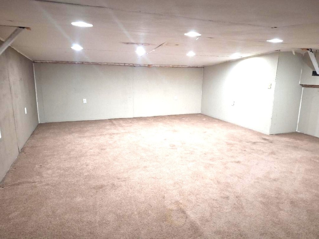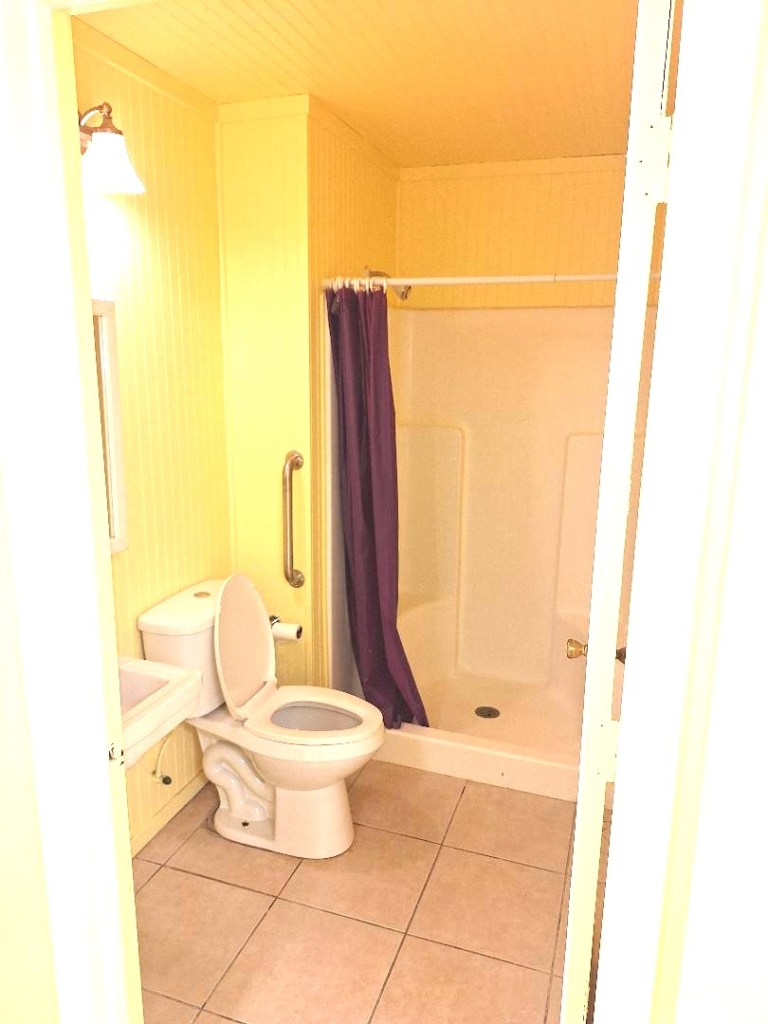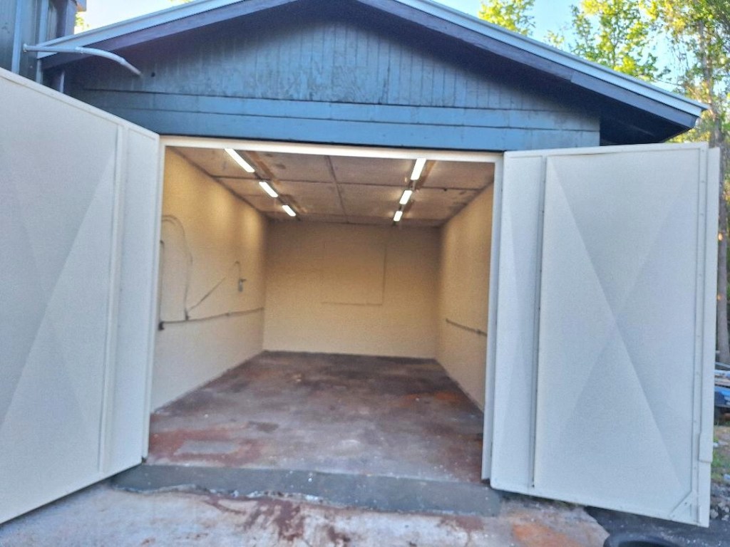 A concrete building, previously used as a paint booth, measures 28 ft deep by 14 ft 9 nine inches wide. It includes 120 volt receptacles and LED tube lighting. The heavy duty door measures 9ft 9 inches tall by 12 ft wide.