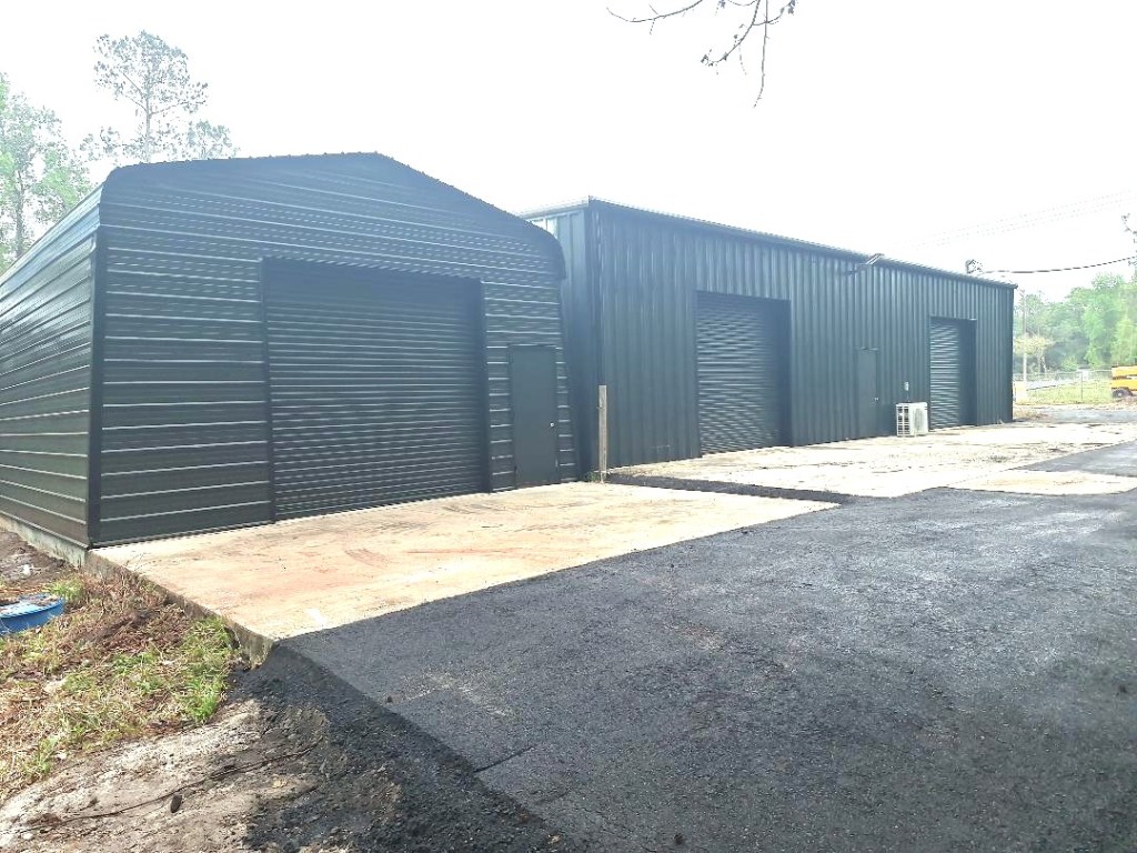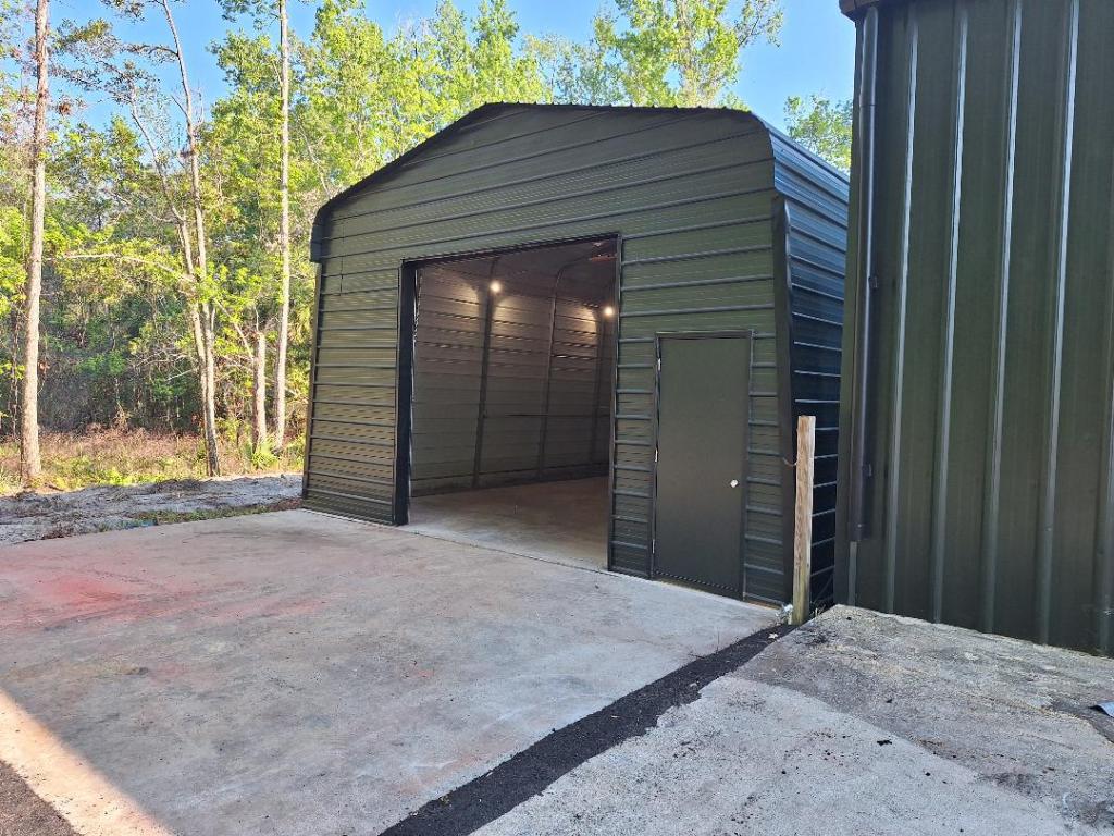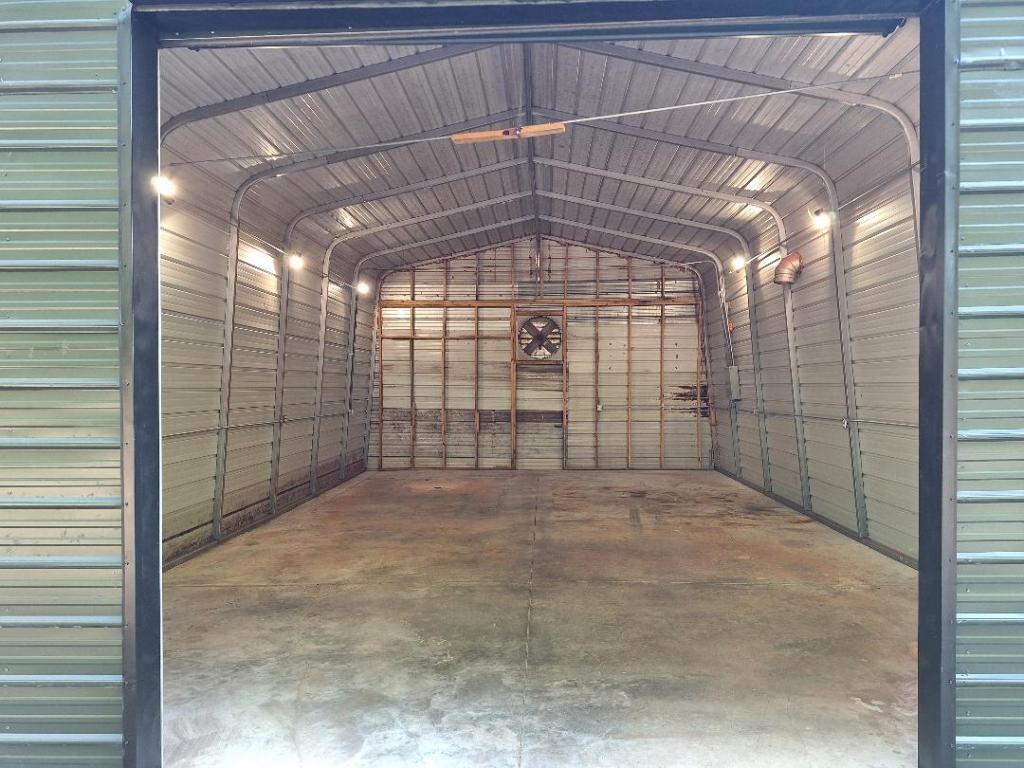 The steel auxiliary building measures approx 34.5 by 21.5 ft. The new roll up door is 10 by 10 ft. There is also a functional exhaust fan.
